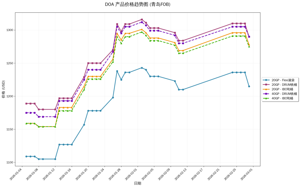 📊 1. The Peak is Behind UsThe price of DOA hit a ceiling in early February 2026, across all categories including Drums, IBC, and Flexibags. If you’ve been waiting for the “right moment” to restock, it looks like that peak has already passed.